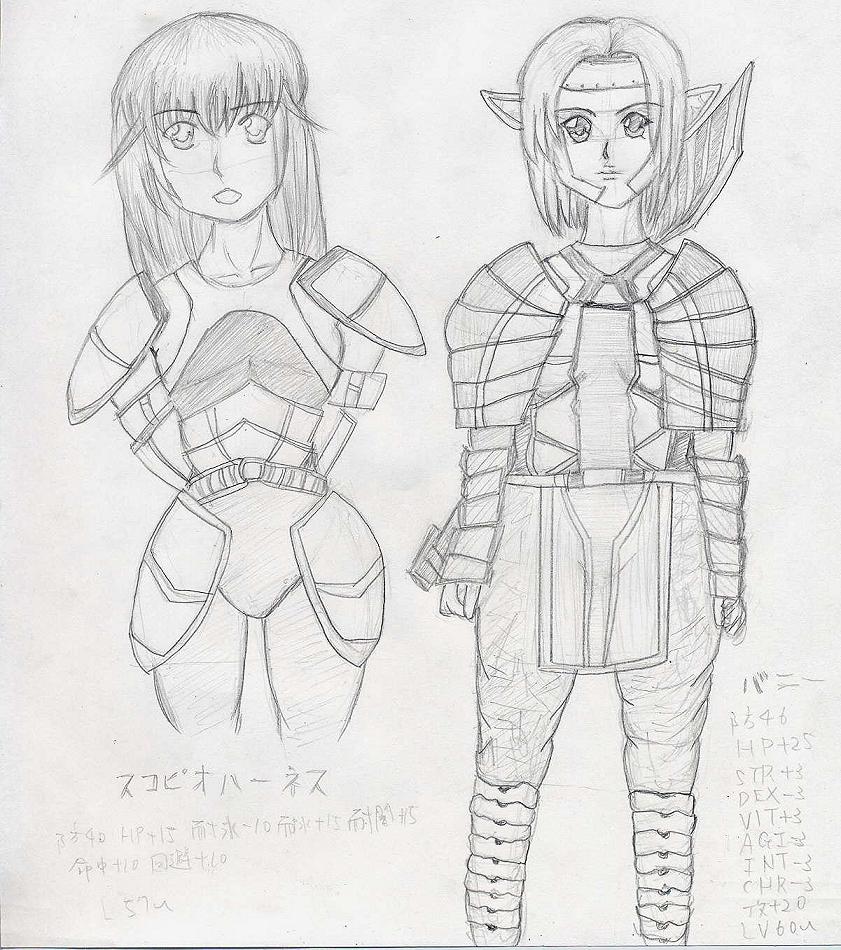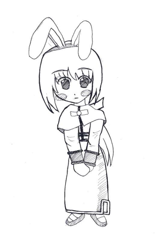 | [2004.12.20] 別案として書いてきた一人、同じく長めの髪で途中からはねる様なクセのある髪が特徴 私的には天然が入っているような感じで書きました。もう一人は、FF11を懐かしくて書いたもので、二人とも服は、 FF11のスコピオハーネス。バニーを意識して、それをアレンジしたものになってます。バニーを着ている方は、 オリジナルだけど、まったく関係の無いキャラw |