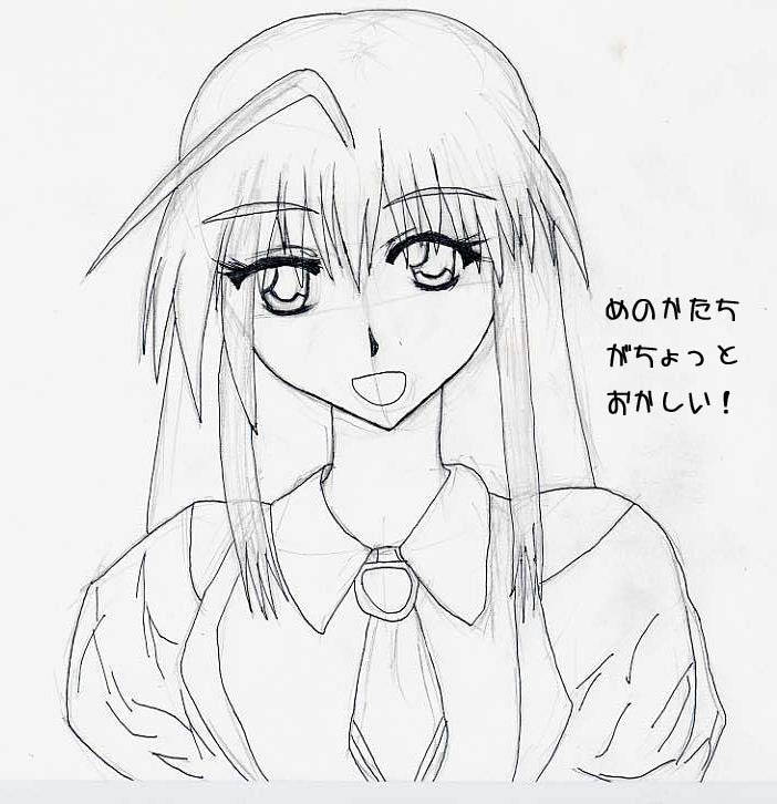 | [2005.2.19] 立ちアコを使っていた時に、立ちアコを見ながら書いたもの。 先輩にも言われましたが、できあがったあと、まぁまぁのできだと思った。 ただ傾いているのとほおベニが右側にずれているのが失敗した。 でも、いい感じにできたほうだと思います。 |