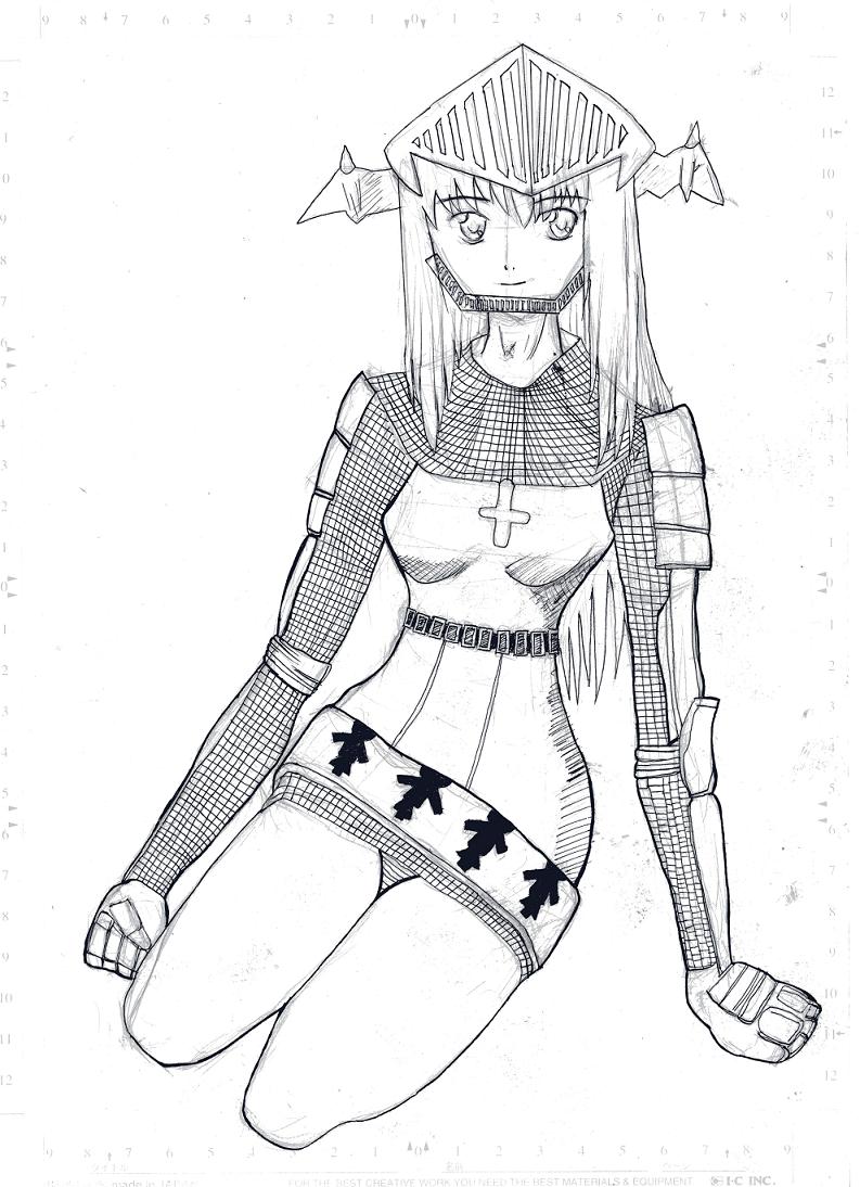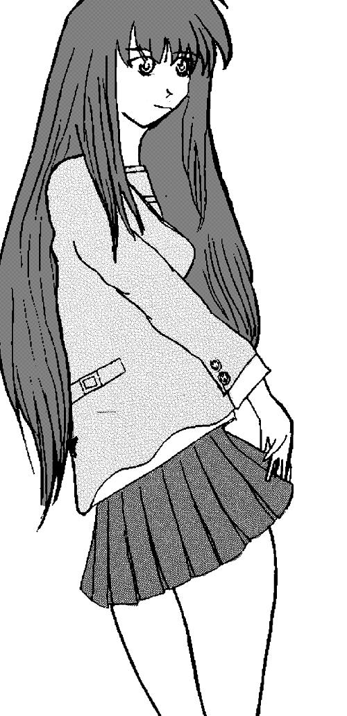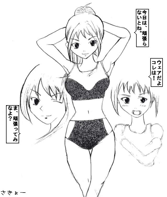 | [2005.6.12] あれの中では一番自分好みの感じであり、設定もそんな感じなので引き続き書いてみた。 書いてて思ったのが難しい構図で、腕の長さ胴体の繋がり、奥行きの表現などがあり、 特にくびれ付近の繋がりがいまいちになってしまった。それにあいからず絵が下手だなと思う所。 ペン入れもミスして顔や服が変化しているし髪の曲線もぜんぜん、 とりあえずこの辺からは原稿を頑張りたい所。 |